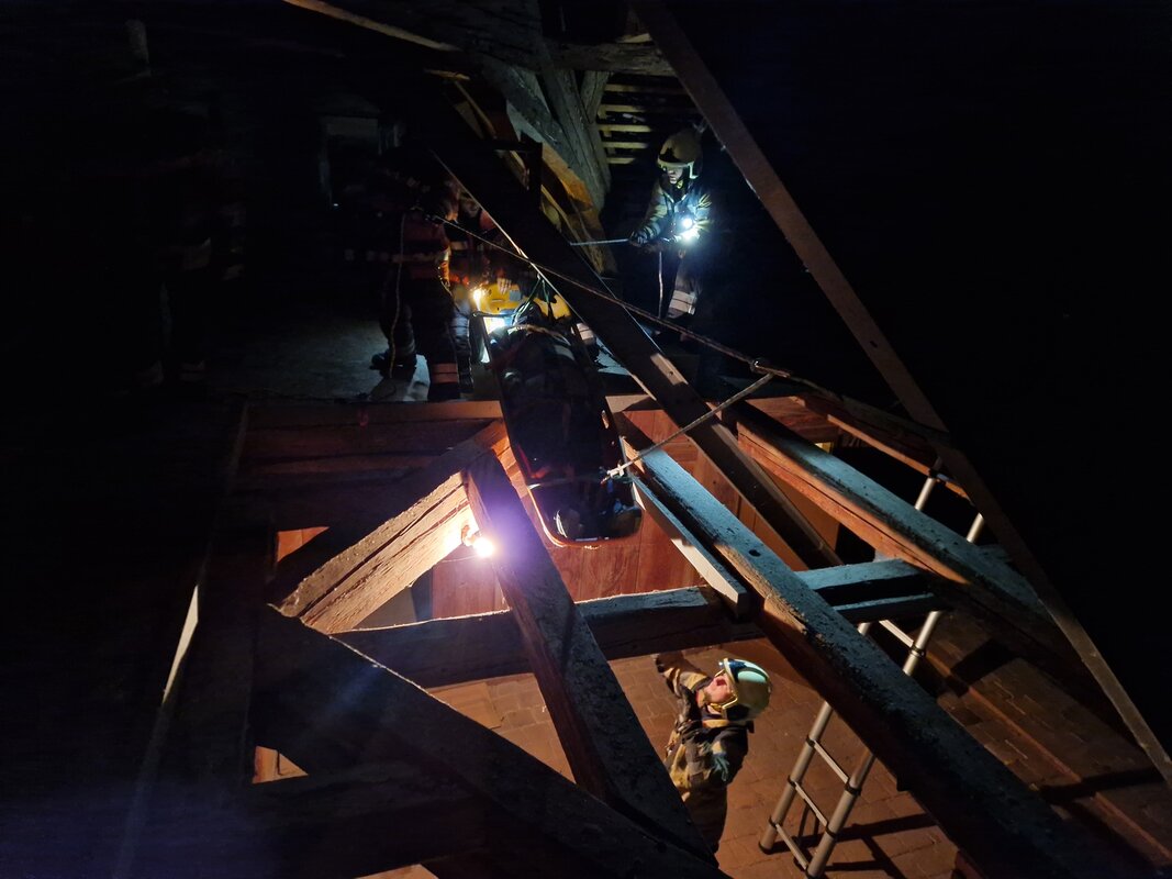 Zuletzt galt es, zwei verletzte Personen aus einem Dachstock zu retten, eine davon bewusstlos. Die bewusstlose Person wurde mithilfe des Schlittens über die Handschiebeleiter nach unten gebracht. Die zweite Person, mit einem Beinbruch, wurde im Tragkorb schonend durch das Treppenhaus transportiert. 🪜⛑️