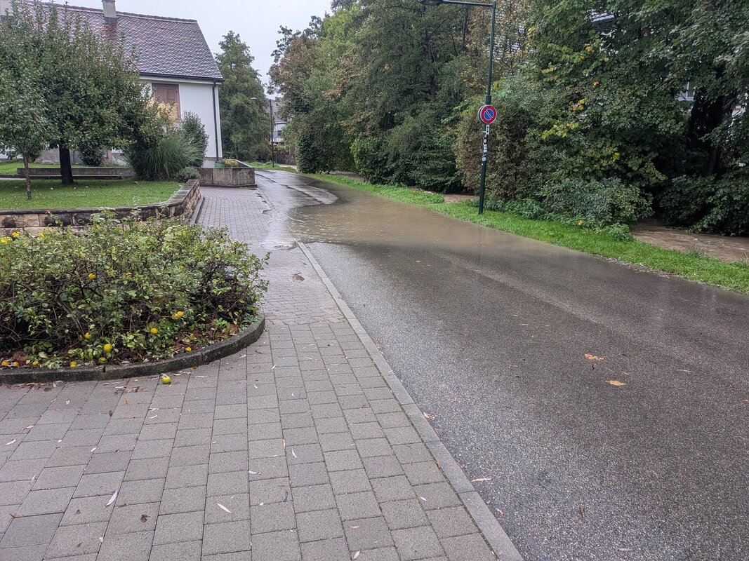 Beschreibung: Nach mehreren Regenschauern erreichte der Birsig um 9 Uhr den Pegelstand bei welchem das Wasser auf Niveau der Strasse steht. Bei einzelnen Häusern direkt an der Birsig wurden Massnahmen eingeleitet um auf ein mögliches weiter steigen der Birisg vorbereitet zu sein. Da der Regen nachliess, und der Pegel zu einem späteren Zeitpunkt wieder anfing zu sinken konnte auf weitere Massnahmen verzichtet werden.