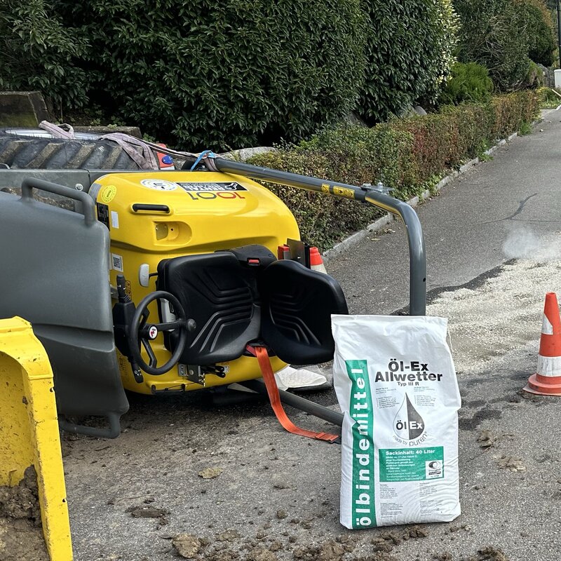 Beschreibung: Bei Gartenarbeiten ist ein Dumper auf die Seite gekippt, welches danach Öl verloren hat. Der AdF der Feuerwehr hat das ausfliessende Öl aufgefangen und eine private Strassenreinigungs Firma, die schon im Dorf war, aufgeboten.